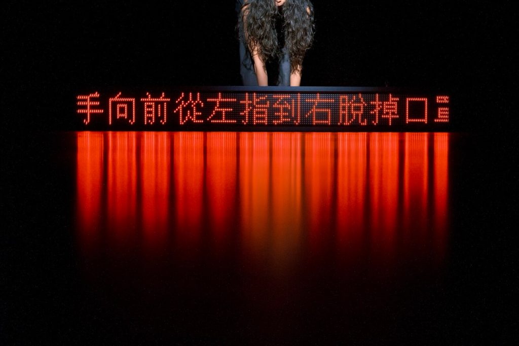 她接著又從椅子回到地面,身體時而扭曲、時而放鬆。音樂混入Techno(科技舞曲),明確的鼓拍帶動節奏,將整個舞作拉到高潮:一段結構即興穿插上個段落出現過的數字pose,刻意地打破那些「正常」動作的軌跡,像是再也無法控制長久以來抑制住的本性,能量在體內暴衝,彷彿壞掉漏電的機器人。諸如此類秩序與混亂之間的對比在舞作中反覆出現,在規規矩矩的縫隙間趁機叛逆,皆是略帶戲謔的挑釁。