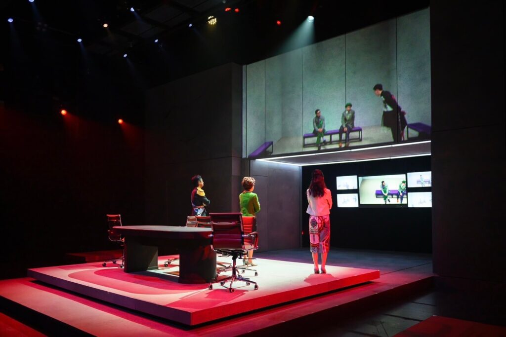 但與此同時,下半場一段透過政論節目形式呈現王國臣民八卦上位者的喜劇改編,幾位學生演員的拋接及對模仿人物形象的掌握都十分精準,不僅發揮推進劇情的功效,也引發現場觀眾極大的共鳴,展現出學生製作的生命力,個人覺得是此次演出中最大的亮點──也許主創團隊可以藉此重新思考選本及導演的策略。