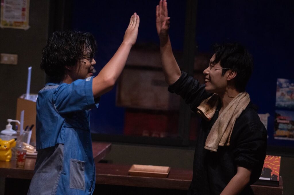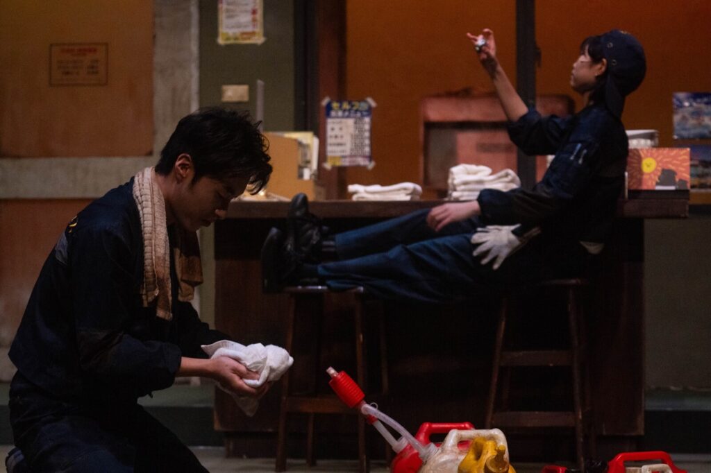 相較之下,台大的版本雖展現強烈的創作野心,卻在整體調性與邏輯建構上略顯混亂。在視覺風格上,演出結合了日本與台灣的空間語言,乍看之下呈現出一種具有前衛的文化雜交。然而,這樣的融合若僅停留在舞台美術層面的表層拼貼,而未能與文本內容、角色語言或在地處境產生實質連結,反而會造成一種指示不明的文化背景,使空間成為概念上空轉的容器。坂元原作中的加油站是一處極其特殊的地點:它不是特定地域的表徵,而是一個「無地之地」——一個折疊記憶、孤立情緒、懸置關係的精神中繼站。在此製作中,加油站、便利店與家的空間邊界被模糊處理,物件設計雖然繁複,卻缺乏敘事功能與心理對應。例如室內設有轉向鏡、角落堆疊著大量用途不明的書籍等道具,雖可能試圖營造出時間停滯與意象重疊的氛圍,實際上卻未被有效納入角色動線與心理狀態之中。這樣的處理反而使視覺訊息過於雜沓,不僅難以承載敘事,也干擾觀眾的注意力。這種混亂的空間語彙,在結尾處尤為突出:舞台投影出日語歌曲與日式影調的畫面,與整體空間中明顯偏向台灣在地的布景風格直接疊合,造成視覺與文化上的突兀。更讓人困惑的是,製作中的空間美術與場景設計整體呈現出一種較為「懷舊式」的視覺調性——加油站與便利店的裝潢風格與物件質感帶有濃厚的年代感與經濟匱乏氣息,甚至比後段投影中「小時候的場景」更顯得時代倒退。這種時間與物質的錯置,使我在其中所接收到的,不是「更貼近自身處境」的觀看經驗,而是一種不確定這齣戲「發生在哪裡」、角色「屬於哪裡」的語境漂浮。當這些來自場景、道具與影像層的訊息未能在敘事層整合為一套能夠引導觀眾閱讀的語法時,它們就不再只是形式問題,而是直接侵擾觀眾感知與理解的劇場經驗。