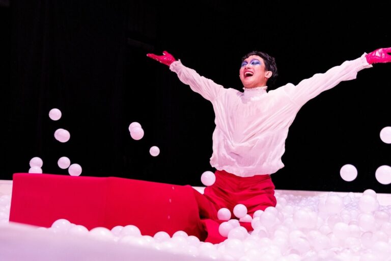 And what better medium than a screen to appear as what you are not? If the four monitors (two on each side of the scene), haphazardly gleaning images of the characters’ lives while they’re not on stage, certainly come to mind, there is a fifth and final one in the form of the set itself. An all-encompassing and hollow white structure, shaped like the edges of a trapezoidal prism, is facing the audience, akin to the skeleton of a cathode-ray tube (CRT) television where images are modified and amplified before being projected to the viewers. Its base is transformed into a shallow white ball pool and is the main stage for the dramatic action. The entire scenic device resembles the set of a reality TV show where the family-contestant is constantly observed and judged. The public, responsible for its own gaze, can watch their most private instants on the lateral panels, whether they are sitting on the toilet, training with a punching bag or praying.