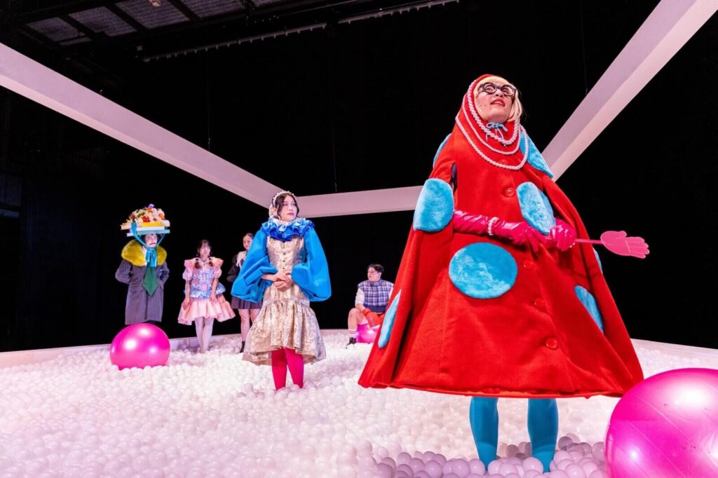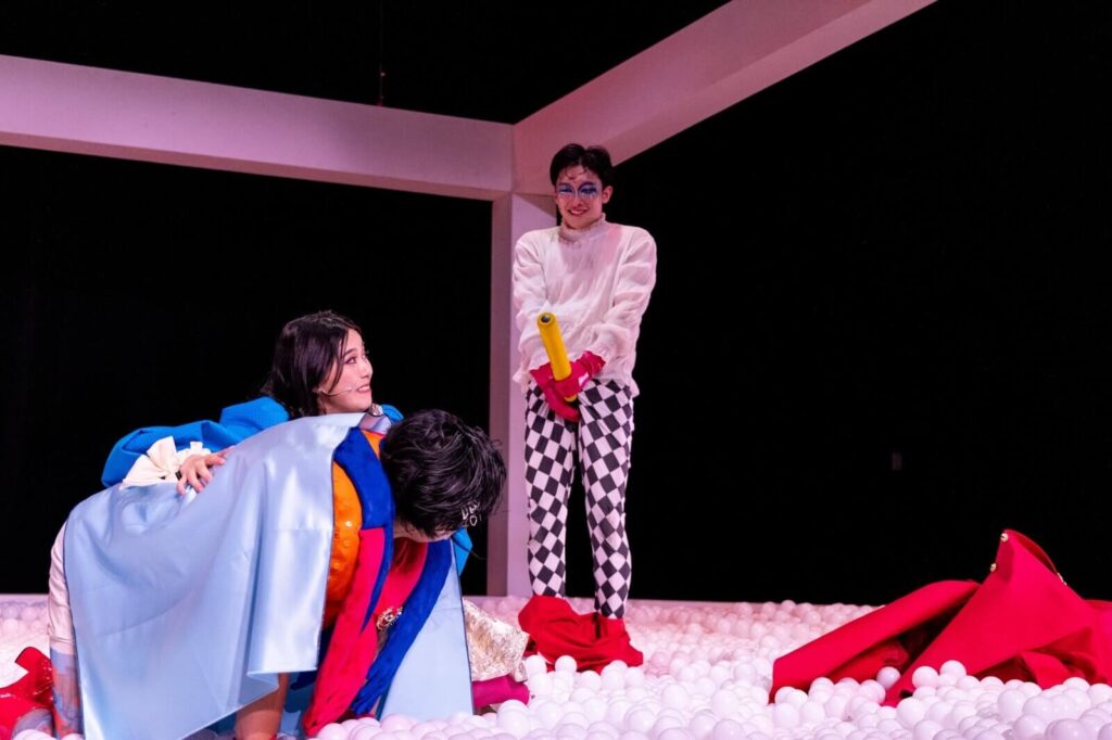 However, as with every other true communication attempt on stage, it turns into a childish and ridiculous game. The white ball pool, main stage of the play, renders even a normal step comical as the balls makes any move difficult and are often leaking through its sides. Marianne dances as she pretends to dislike Valère, Damis beats on pink beach balls when Orgon doesn’t believe him and Tartuffe places his newly acquired bat in a certain place to mimic a certain body part to seduce Elmire. Being used to interact with another’s forged virtual presence, it becomes impossible to act properly with his true self. Even the deus ex machina of the royal agent, saving Orgon’s family from ruin and allowing the happy ending of Valère and Marianne’s wedding, doesn’t solve this issue and Tartuffe, now prisoner of the king, understands it. He goes out of stage from the back curtain, revealing the backstage area where the marriage we see on the screens is supposedly happening, but it’s empty.