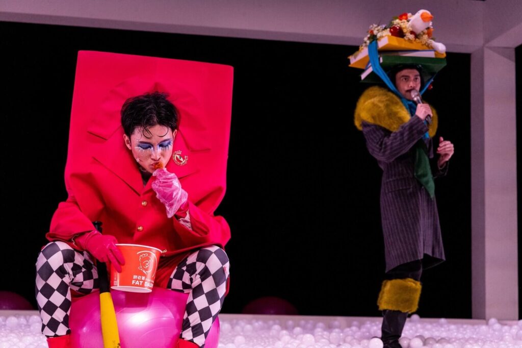 His image is always at the center of the plot. He is described profusely before ever appearing on stage. We see him, on the lateral monitors, either oneirically strolling in slow motion while Orgon sings his praise to Cléante, or mischievously eating the Guai Guai supposed to be a part of a religious offering when someone is badmouthing him. He wears a bright pink square-shape costume that covers his ears, similarly to Madame Pernelle, but until he is given the baseball bat toy by Orgon – a childish representation of the ownership of the house as well as a phallic symbol of men’s make-believe authority – he doesn’t hold power. The impression he makes is, as for anyone else, often out of his control: despite Tartuffe having no motive to instill fear, his first stage entrance is accompanied by Prokofiev’s ominous Dance of the Knights. The only moment his outer aura is in adequacy with his inner character is when he is with the object of his love. Here, the music becomes calm and romantic and Tartuffe manages to come out of his rose shell, revealing a pristine white blouse.