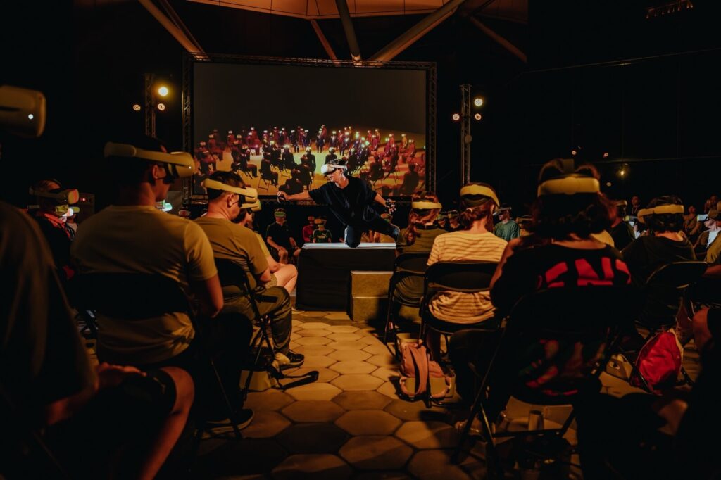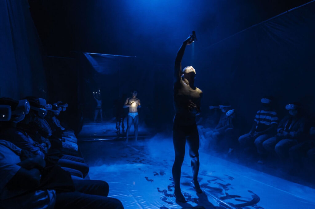 上大學之後,我透過一些學校的課程更加認識「科技藝術」是什麼,例如王正源老師在戲劇系開設的劇場影像相關課程,或者是羅禾淋老師所開設的「沉浸式科技劇場專題實作」。但若是要談及我第一次深入接觸科技藝術,就是大四上的那個學期,我以排練助理的身份參與了周東彥導演的作品《霧中.凝視》。在這個作品中,觀眾戴著VR頭顯,身處在劇場空間,透過現實的空間、表演與虛擬影像的結合,深刻體驗了作品中的世界。透過這次經驗,我見證到表演藝術及VR科技的巧妙搭配,也近距離地參與到科技藝術作品的創作過程。