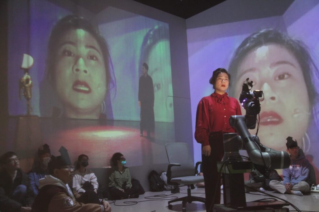 一般劇場可能在敘事上有各種創新,但技術方面通常採用我們比較熟悉的劇場技術。相較之下,科技藝術更像是一場「探索未知」的旅程。我們從一個看似不切實際的構想出發,例如在虛擬空間中共同完成一場演出,到開發一種觀眾所不熟悉、未知的技術,例如VR劇場。而奧妙之處在於,透過探索這個未知領域,我們不僅見證了新技術的誕生,同時也開啟了新的敘事可能性。就像《霧中.凝視》一樣,我們發現了原來現場表演和虛擬世界的影像可以如此融合,不再是觀眾被動地在自己的世界中觀賞VR作品,而是大家可以一同進入這個世界。而在《哈姆雷特機器人》中,我們也發現兩個身處異地的演員,可以透過影像在同一個空間演出,並且透過即時影像生成技術,達到現實與虛擬世界結合的巧妙狀態。