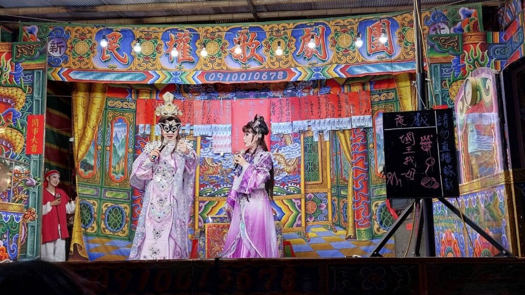 說了一些對於戲台上的觀察,我想再談談戲台下的氛圍,戲台下的觀眾,來來去去,有些是虔誠的信徒;有些是特定演員的戲迷;有些則是碰巧路過而駐足欣賞。每個人想從戲中獲得的東西都不同,外台戲的隨機與靈活也展現在觀眾身上。這群觀眾大多是年紀稍長的長輩,或許是語言與欣賞美學的隔閡吧?以致年輕人很少主動去親近戲台,我想若我沒有出生在一個與歌仔戲緊密連結的家庭,我可能也會像大多數的同齡之人一樣,對於本土的戲曲非常陌生。然而幾次在廟口看戲時,都會觀察到少數廟宇附近的青壯年居民,晚上下班回家後帶著孩子外出散步,經過戲台時父母總會細心地向孩子介紹戲台上在做什麼。我在一旁覺得十分的溫馨,我在想,我們常說演員與觀眾都需要傳承,那怎樣的觀眾傳承可以最深刻呢?在幾對的父母親與孩子們的互動中,我發現「環境」才是最重要的。當清澈稚嫩的雙眸映入了戲台的同時,他們與當地廟宇文化、本土文化的連結也從此展開。未來他們長大了,有機會就會主動親近歌仔戲,不論他們是誰,來自何方,這片「外台」的天地始終敞開著,以其特有的魅力迎接每一位觀眾。