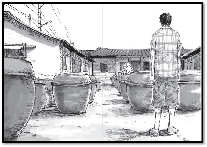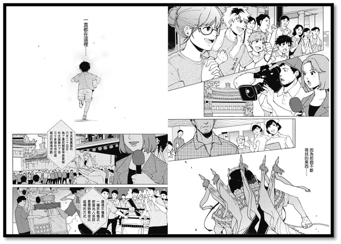 此外,漫畫家亦會花心思繪製不同的構圖呈現時間流動效果。如「順序與倒敘並存」一圖,人的正常感知順序應是山本太太聽見遠方的人先呼喊自己,其視線才會往後移動。但圖中聲音出現及視角移動是同時並行存在的,這不僅調動讀者心理運作時間軸,還藉視線移動控制讀者感知時間,形成一種不知孰先孰後,在感知上卻又能自洽的狀況。