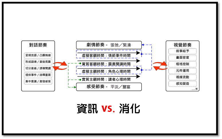 當四條時間軸同時運作,讀者心理會被一連串虛實時間交錯帶動,感受到漫畫獨有的時間認知,對白、符號、速度線條和擬音狀聲字等,則成為推動時間效果的重要元素。漫畫每一格都有四條時間軸,如何適宜地調配其中「節奏」是漫畫家苦難來源,卻同時是建築成就感的基石。
