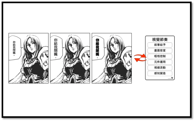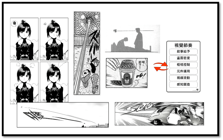 總而言之,漫畫敘事手法看似複雜,其實核心技術只有一道:「時間控制」。出版社編輯的責任正是協助漫畫家調整故事的節奏與時間。所有技法皆為了使讀者心理時間發酵,使靜態演譯為動態。正因讀者心理時間各異,且可自行決定閱讀圖像的時間與篇幅,因而產生較高的「接受自由度」,這是漫畫與影像的顯著差異,卻也是漫畫影像化時容易忽略的核心。