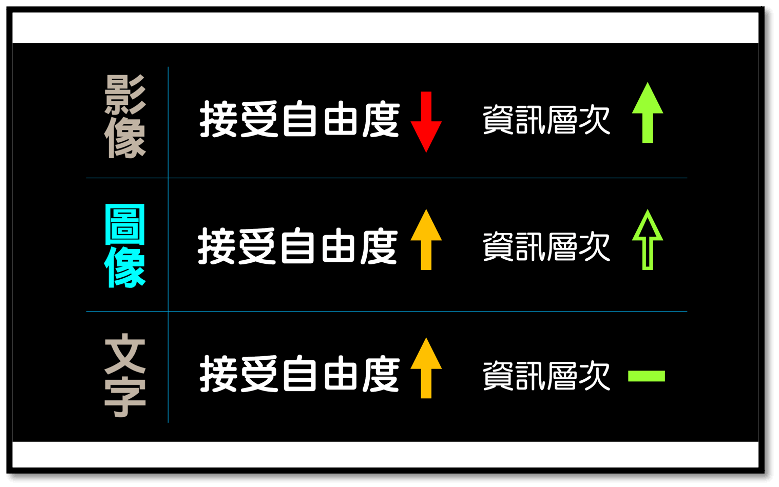 周老師認為,從漫畫到影像化的改編核心問題,恰是圍繞在改編者能否釐清載體「接受自由度」的差異性,及如何轉化不同載體之間「資訊層次」。「接受自由度」,是指接受者能否自行決定閱聽過程的進度及理解詮釋的程度。影像、圖像和文字的「接受自由度」與「資訊層次」各有不同。請見下圖: