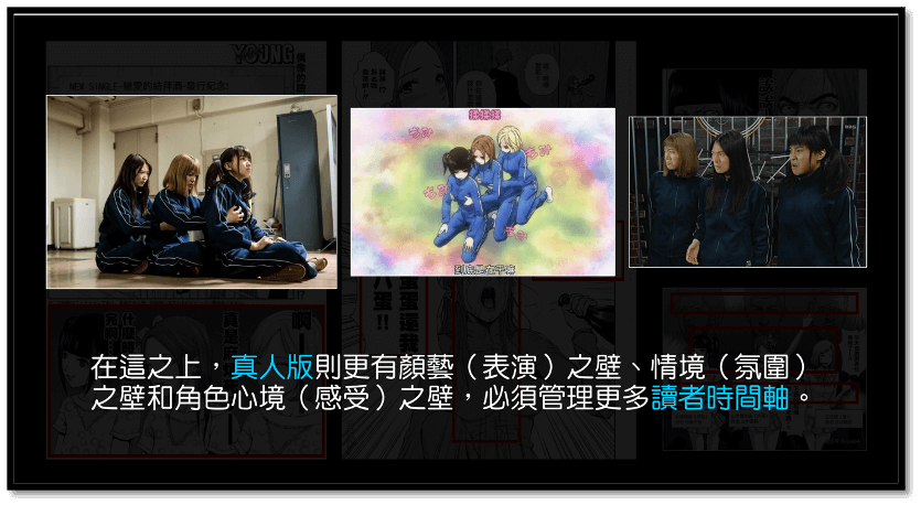 文字的「接受自由度」雖高,但「資訊層次」都必須靠感知想像加以補充,衍生空間大,卻又都處於相同的處理維度;影像「接受自由度」雖低,但畫面快速呈現的內容卻可以包括音樂、音效、速度、對話、字幕……等多重軸線,「資訊層次」最高;圖像「接受自由度」高,以視覺導用各種具體感官經驗的特性,則令「資訊層次」介於文字與影像之間。載體之間的差異性,使得圖像改編影像時,原作調性和製作意識變得相當重要。例如《後街女孩》自我吐槽及吐槽他人的搞笑節奏,在漫畫中可藉由讀者的心理時間差作修正調度,但改編成動畫和真人化後,則完全無法呈現作品的節奏與調性。影像化意味著,從運鏡、對白、音效上都是即時性的呈現,漫改作品的表現效果總不免撞上載體之壁。此外,真人版則更有顏藝(表演)之壁、情境(氛圍)之壁和角色(心境)之壁,必須管理更多觀賞者的時間軸,若無法跨過各種「壁」之挑戰,則容易製作出尷尬及怪異感的作品。