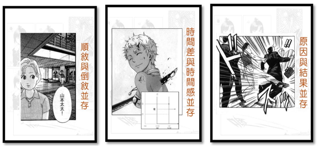 「時間差與時間感並存」一圖,人物表情與反應,像是利刃刺入前的狀態,但若同時畫出利刃刺入身體後的圖像,將產生瞬間的速度感與時間差感受,形成不一樣的時間張力。「原因與結果並存」一圖,則應是人物被踢後,手提袋方會掉落,此構圖卻使因果時間被揉合在視覺移動過程中,使兩者發生並存。